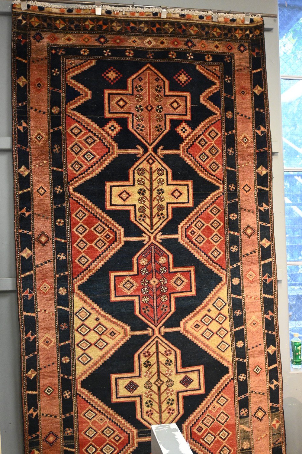 A BEAUTIFUL RARE PERSIAN TRIBAL SARDASHT MIYANEH RUG. 100% WOOL, NATURAL DYES FROM THE AZERBAIJAN PROVINCE. A VERY UNIQUE TRIBAL CARPET WITH CONTINUING TRIBAL MEDALLIONS CONTAINING TREE OF LIFE DESIGN IN TONES OF RED AND CREAM ON A CHARCOAL FIELD. A TRIPLE BORDER OF ROSETTES AND TRIBAL MOTIFS. SIZE: 417 X 157CM ORIGIN: PERSIA - RRP: $4,900