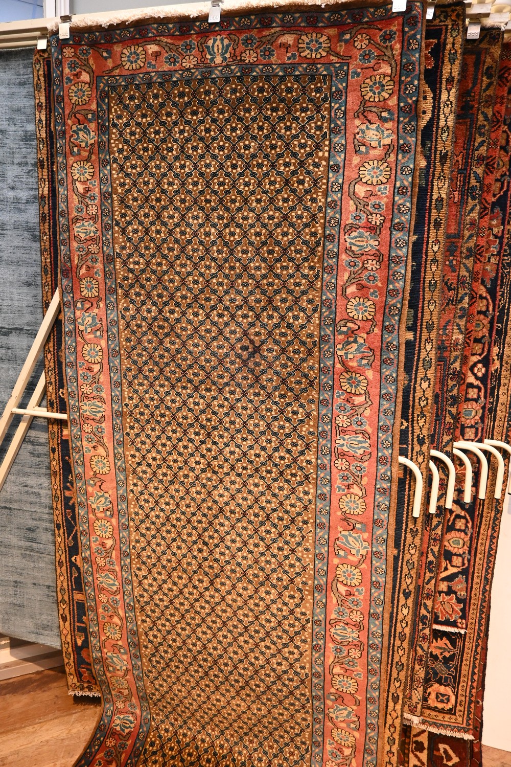 A PERSIAN SONQOR KOLYAIE RUG. 100% DENSE WOOL PILE. FINELY HAND-KNOTTED VILLAGE WEAVE FROM THE KURDISTAN REGION WITH TRIBAL DESIGN OF ALL OVER MINA KHANI IN BLUE & BURGUNDY ON A LIGHT BROWN FIELD. BORDER OF ROSETTES ON A FRENCH BLUE FIELD AND ROSE FORM ON A SOFT RED. VISIBLE RESTORATION (AF). SIZE: 280 X 110CM ORIGIN: IRAN
