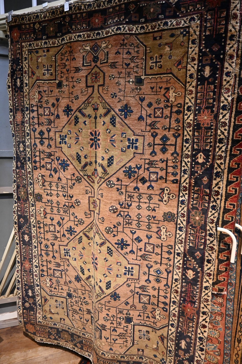 A RARE TRIBAL AVAJ RUG. 100% WOOL. NATURAL DYES. HAND-KNOTTED VILLAGE WEAVE FROM THE QAZVINN PROVINCE WITH TRIBAL DESIGN OF BOLD ANCHORED DIAMOND MEDALLIONS IN PISTACHIO GREEN & CORNER MEDALLIONS CONTAINING TRIBAL MOTIFS WITHIN A SOFT RED FIELD OF FLORAL & TREE OF LIFE & PATTERNS & TRIBAL MOTIFS. BORDER OF ROSETTES. SIZE: 236 X 146CM ORIGIN: PERSIA – RRP: $2,400