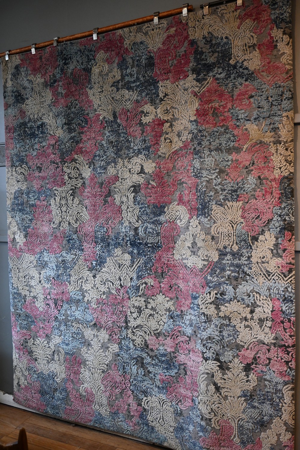 A BRAND-NEW RECREATION OF A FRENCH RENAISSANCE RUG. WOOL & BAMBOO SILKY TEXTURE. FINELY HAND CARVED EMBOSSED IN BEAUTIFUL CHRYSANTHEMUM FLOWERS WITH CONTEMPORARY MODERN DESIGNER TONES OF CREAM, TEAL, SEA BLUE AND CORAL PINK SITTING ON A DENSE GREY WOOLLEN BED. SIZE: 306 X 240CM EX GALLERY EXHIBITED. . ORIGIN: INDIA – RRP: $11,000