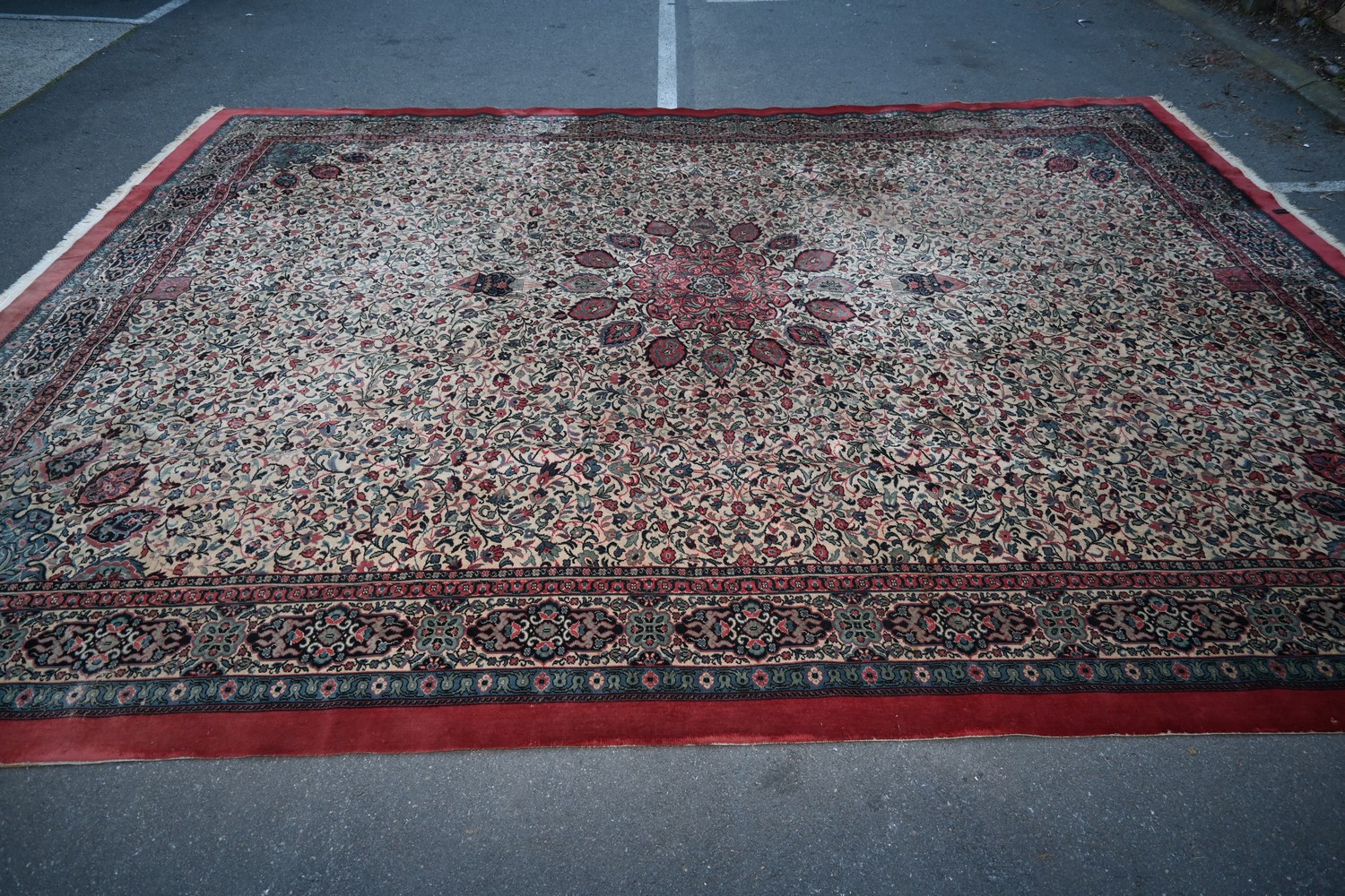 A LARGE PURE WOOL PERSIAN CARPET (A/F) (467 x 365 CM) (PLEASE NOTE THIS HEAVY ITEM MUST BE REMOVED BY CARRIERS AT THE CUSTOMER'S EXPENSE. LEONARD JOEL STAFF CANNOT ASSIST CARRYING THIS ITEM) (X-LARGE ITEM)