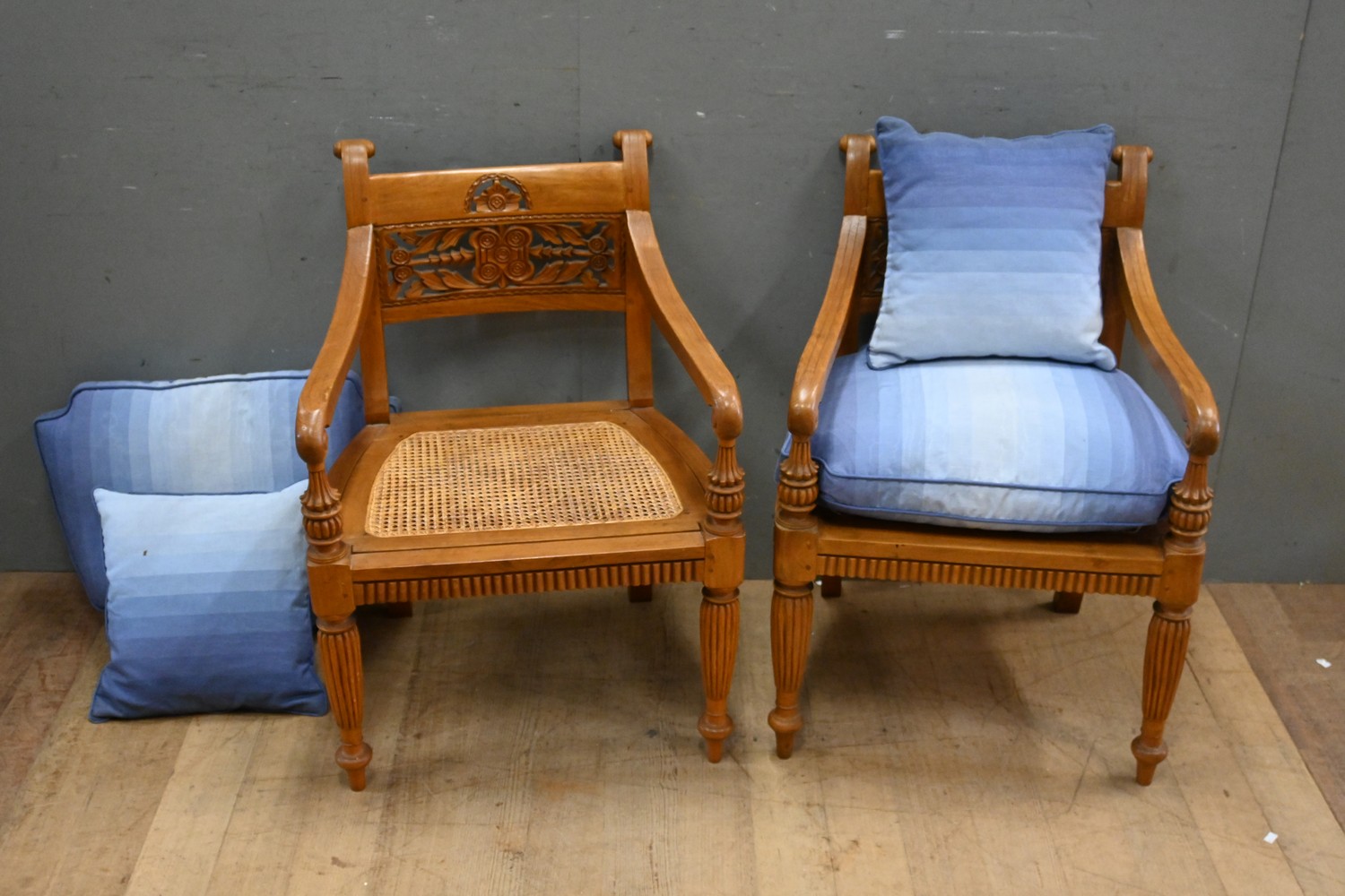 A PAIR OF TIMBER AND RATTAN BASED ARMCHAIRS (A/F) (82H x 59W x 57D CM) (LEONARD JOEL DELIVERY SIZE: LARGE)