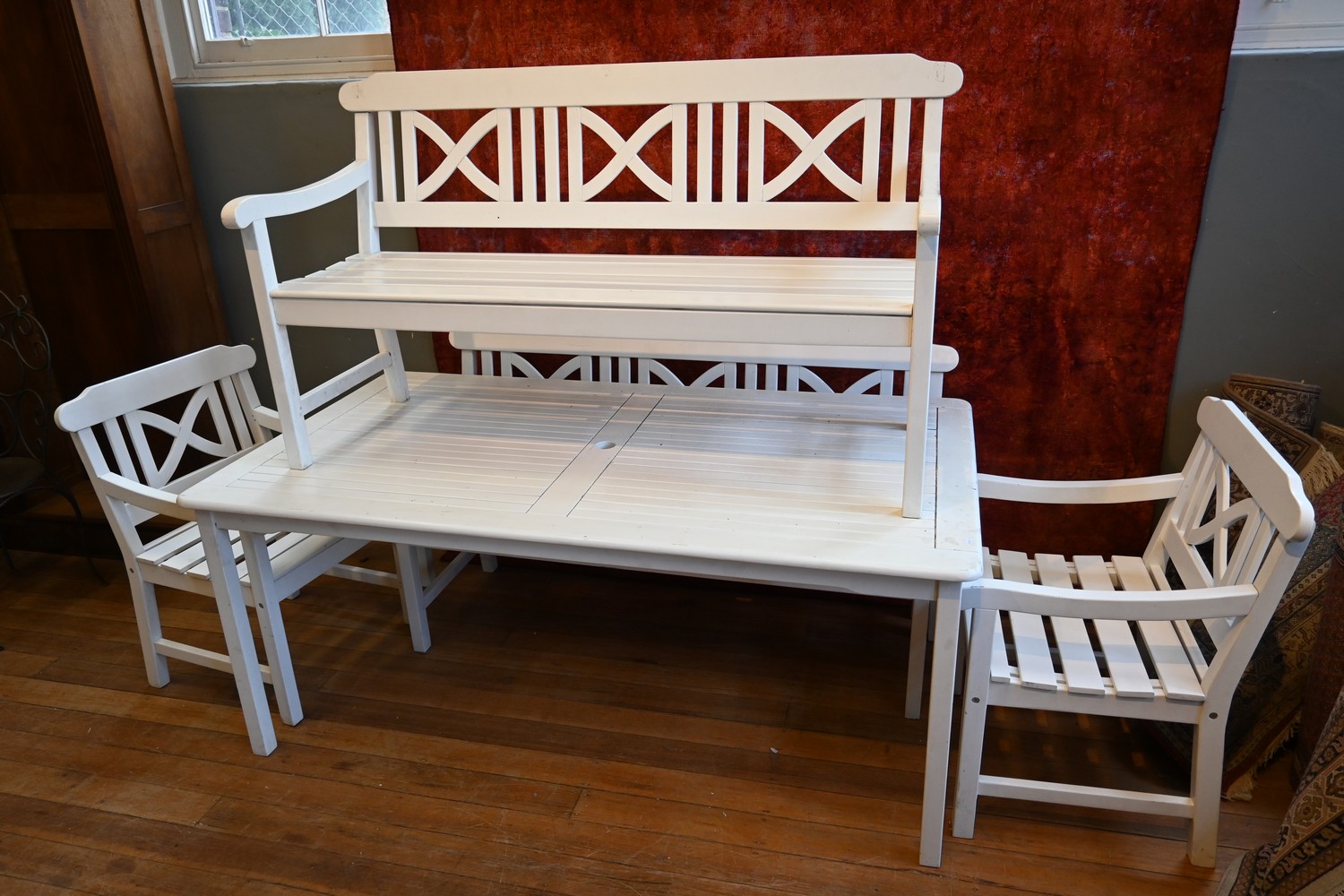 A FIVE PIECE WHITE PAINTED OUTDOOR SETTING (A/F), (TABLE H. 75CM X W. 180CM X D. 100CM)