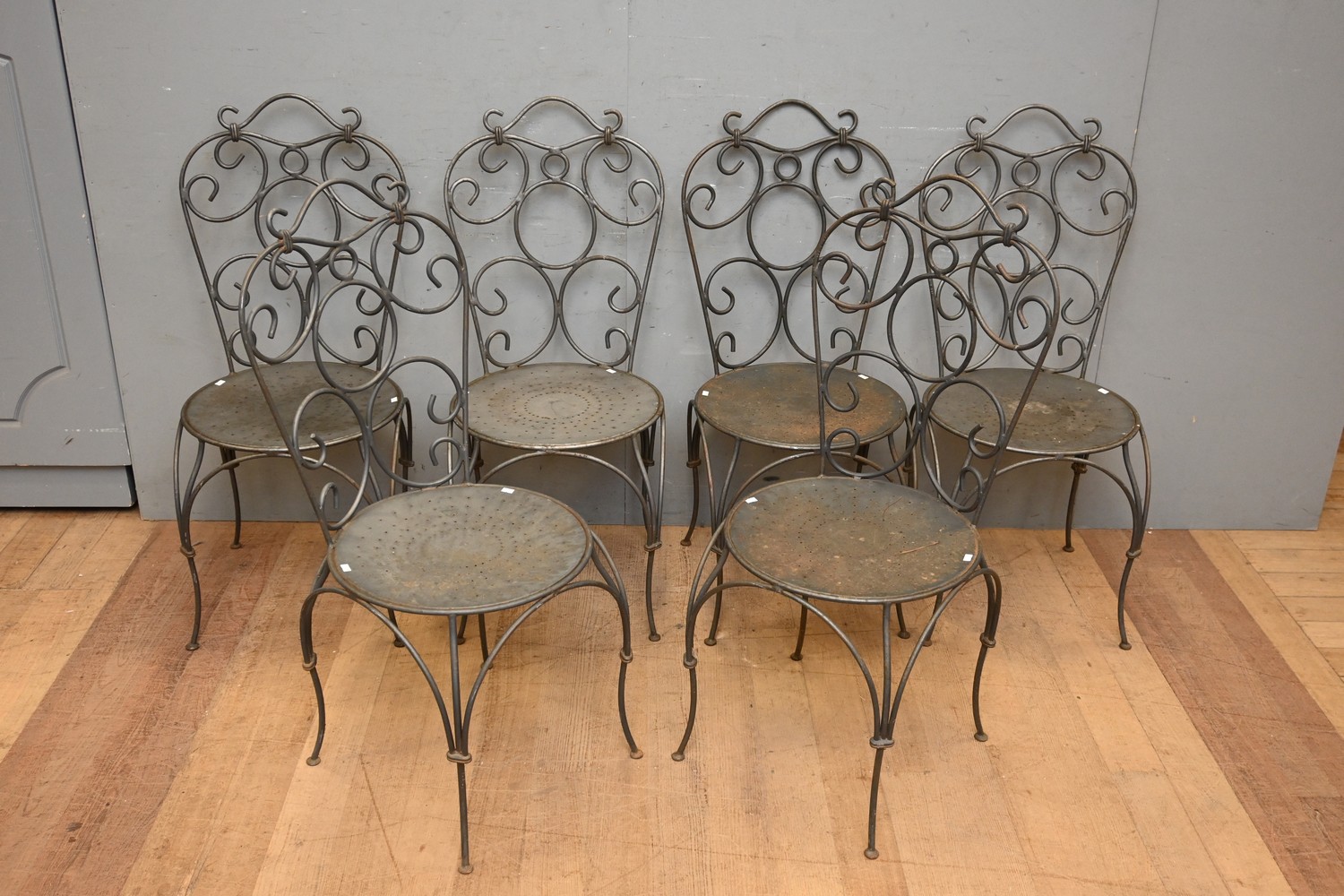 A SET OF SIX WROUGHT IRON FRENCH STYLE CHAIRS (A/F) (105H x 46W x 53D CM) (LEONARD JOEL DELIVERY SIZE: LARGE)
