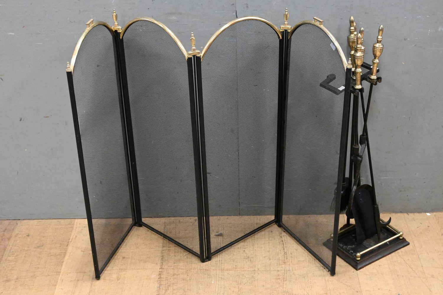 A BLACK MESH FIRE SCREEN AND A COLLECTION OF FIRE TOOLS (SCREEN 63H x 130W CM) (LEONARD JOEL DELIVERY SIZE: MEDIUM)