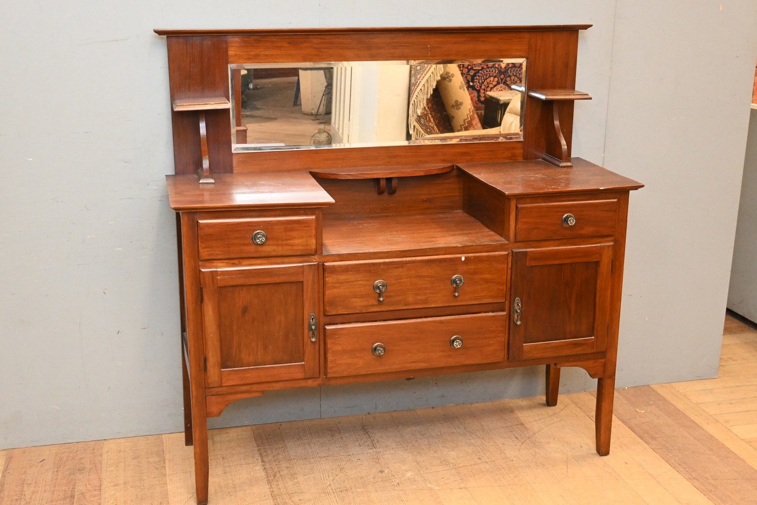 A SUBSTANTIAL MIRROR BACKED TWO DOOR FOUR DRAWER SIDEBOARD (A/F) (148H x 151W x 49D CM) (PLEASE NOTE THIS HEAVY ITEM MUST BE REMOVED BY CARRIERS AT THE CUSTOMER'S EXPENSE. LEONARD JOEL STAFF CANNOT ASSIST CARRYING THIS ITEM) (X-LARGE ITEM)