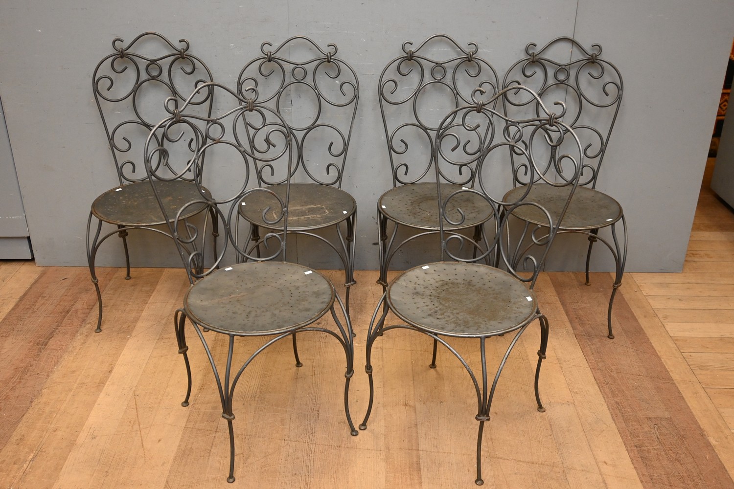 A SET OF SIX WROUGHT IRON FRENCH STYLE CHAIRS (A/F) (105H x 46W x 53D CM) (LEONARD JOEL DELIVERY SIZE: LARGE)