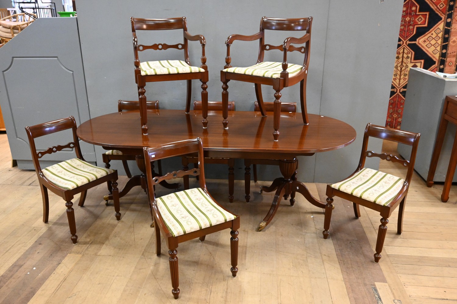 A REGENCY STYLE DINING SUITE WITH EIGHT CHAIRS (A/F) (76H x 223W x 102D CM) (PLEASE NOTE THIS HEAVY ITEM MUST BE REMOVED BY CARRIERS AT THE CUSTOMER'S EXPENSE. LEONARD JOEL STAFF CANNOT ASSIST CARRYING THIS ITEM) (X-LARGE ITEM)