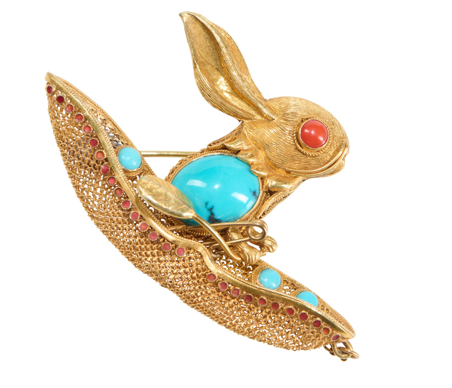 Designed as a rabbit rowing a boat with a leaf stem, the eye set with coral cut en cabochon, its body and the boat detailed with turquoise cut en cabochon, length 50mm.
