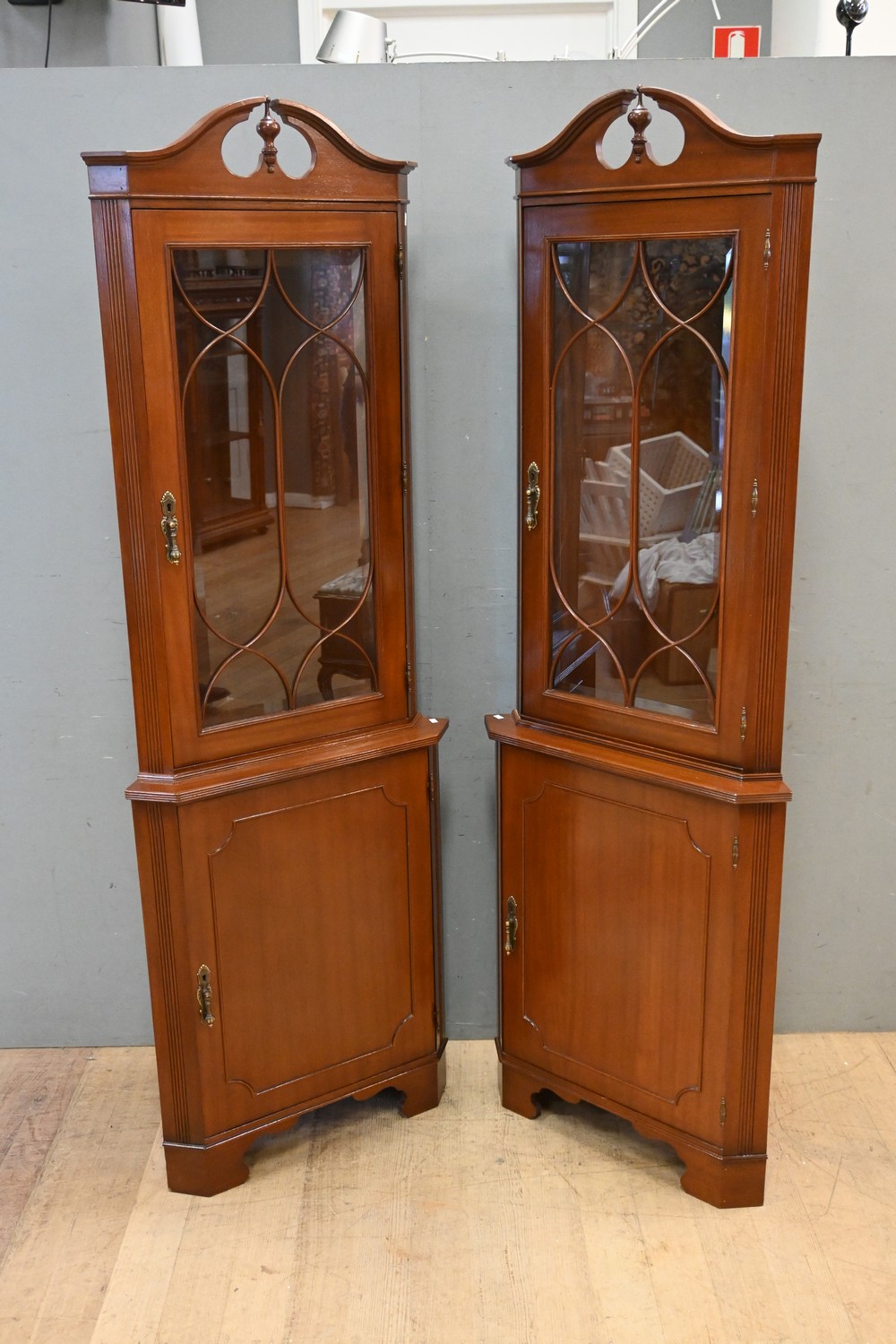 A PAIR OF DOUBLE BODIED GLASS FRONTED CORNER CABINETS (201H x 69W x 44D CM) (PLEASE NOTE THIS HEAVY ITEM MUST BE REMOVED BY CARRIERS AT THE CUSTOMER'S EXPENSE. LEONARD JOEL STAFF CANNOT ASSIST CARRYING THIS ITEM) (X-LARGE ITEM)