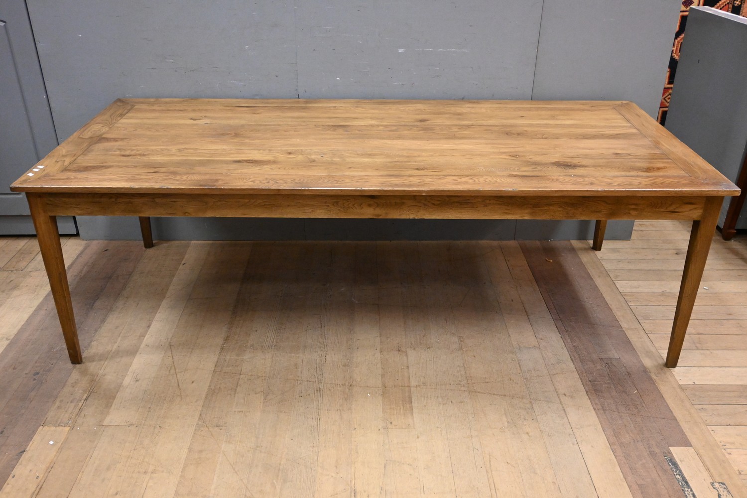 AN OAK FRENCH STYLE DINING TABLE WITH TAPERED LEGS (76H x 241W x 106D CM) (PLEASE NOTE THIS HEAVY ITEM MUST BE REMOVED BY CARRIERS AT THE CUSTOMER'S EXPENSE. LEONARD JOEL STAFF CANNOT ASSIST CARRYING THIS ITEM) (X-LARGE ITEM)
