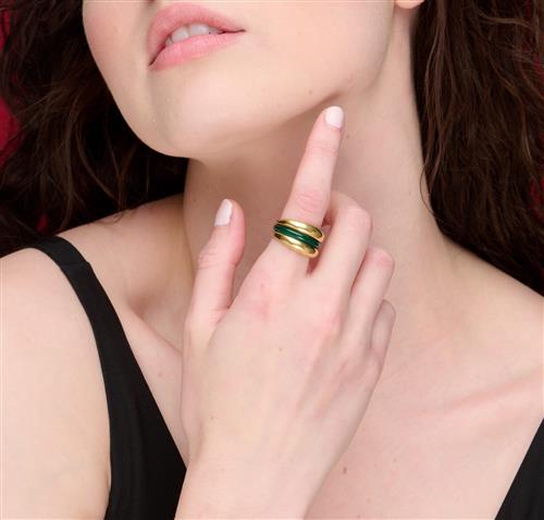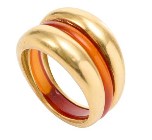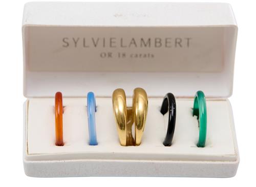 Designed as an open band, accompanied by four interchangeable resin rings in orange, blue, black and green, French marks, ring size L-M, accompanied by a fitted Sylvie Lambert box.