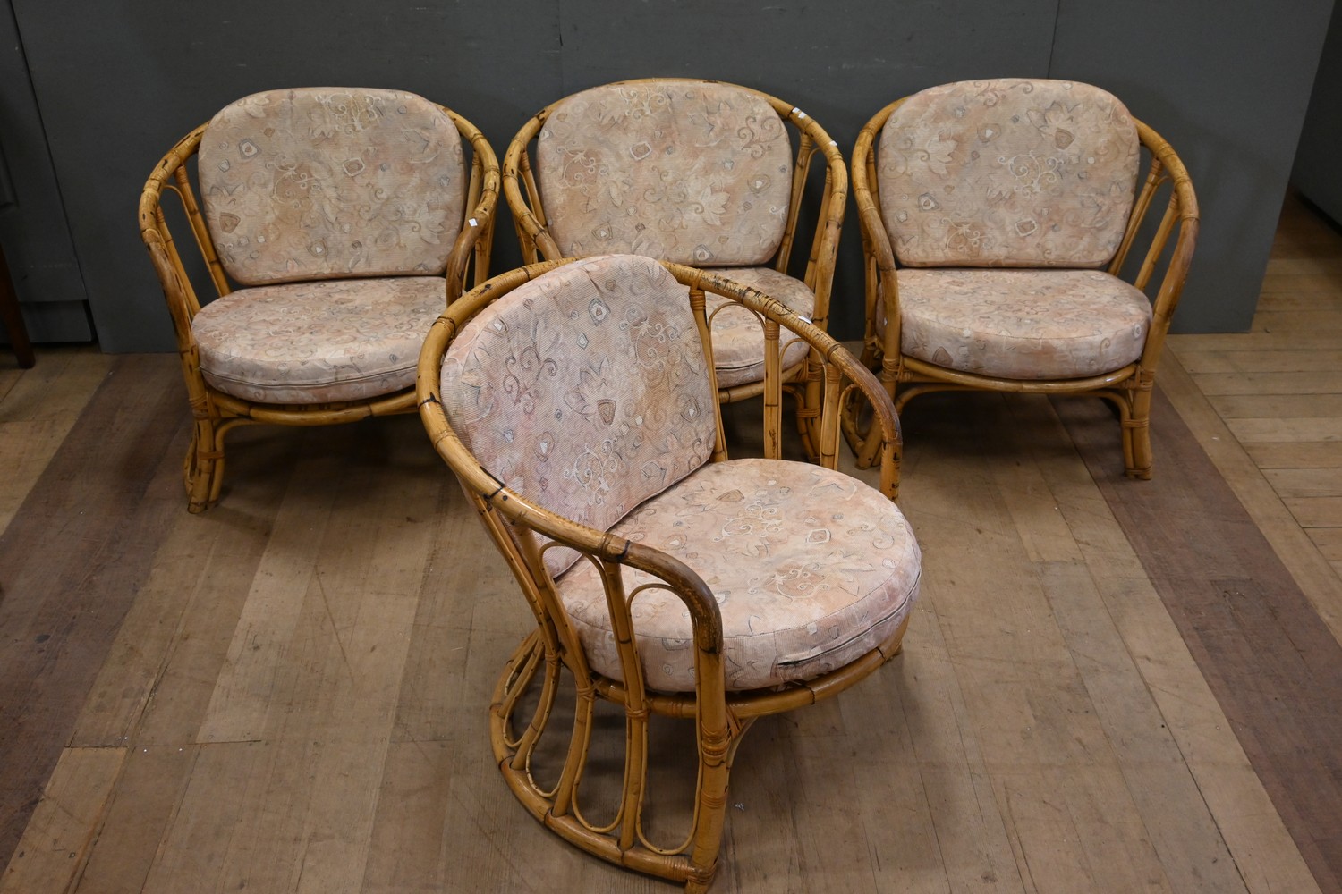 A SET OF FOUR CANE ARMCHAIRS (68H x 72W x 86D CM) (PLEASE NOTE THIS HEAVY ITEM MUST BE REMOVED BY CARRIERS AT THE CUSTOMER'S EXPENSE. LEONARD JOEL STAFF CANNOT ASSIST CARRYING THIS ITEM) (X-LARGE ITEM)