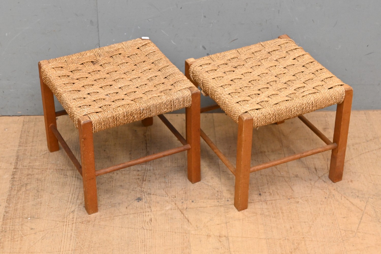 A PAIR OF RUSH SEATED STOOLS (33H x 37W x 37D CM) (LEONARD JOEL DELIVERY SIZE: MEDIUM)
