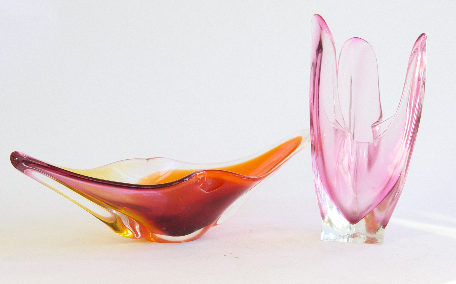 TWO PINK ART GLASS VASES W.41CM, LEONARD JOEL LOCAL DELIVERY SIZE: MEDIUM