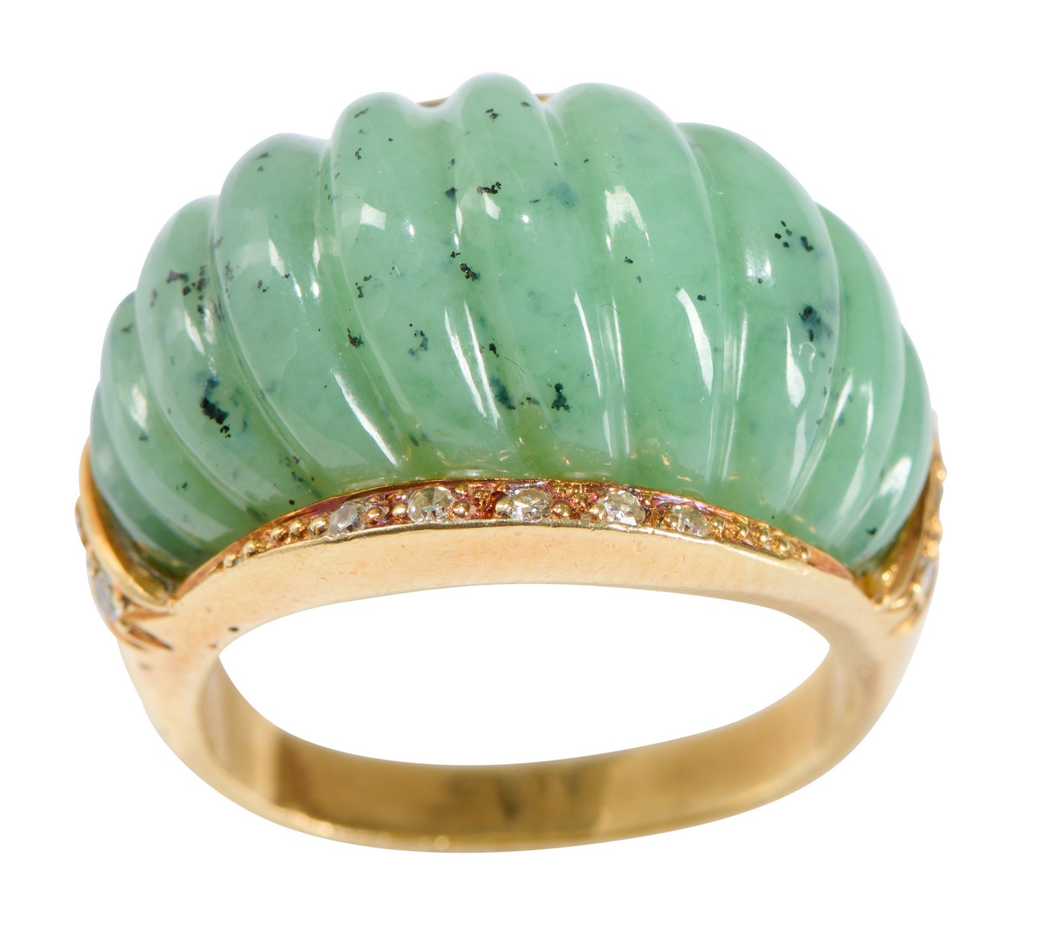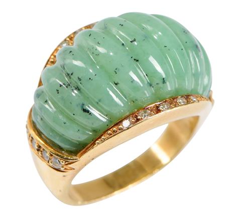 The domed ring, centring a panel of carved hydrogrossular garnet, within a gold border detailed with round brilliant-cut diamonds, ring size M.