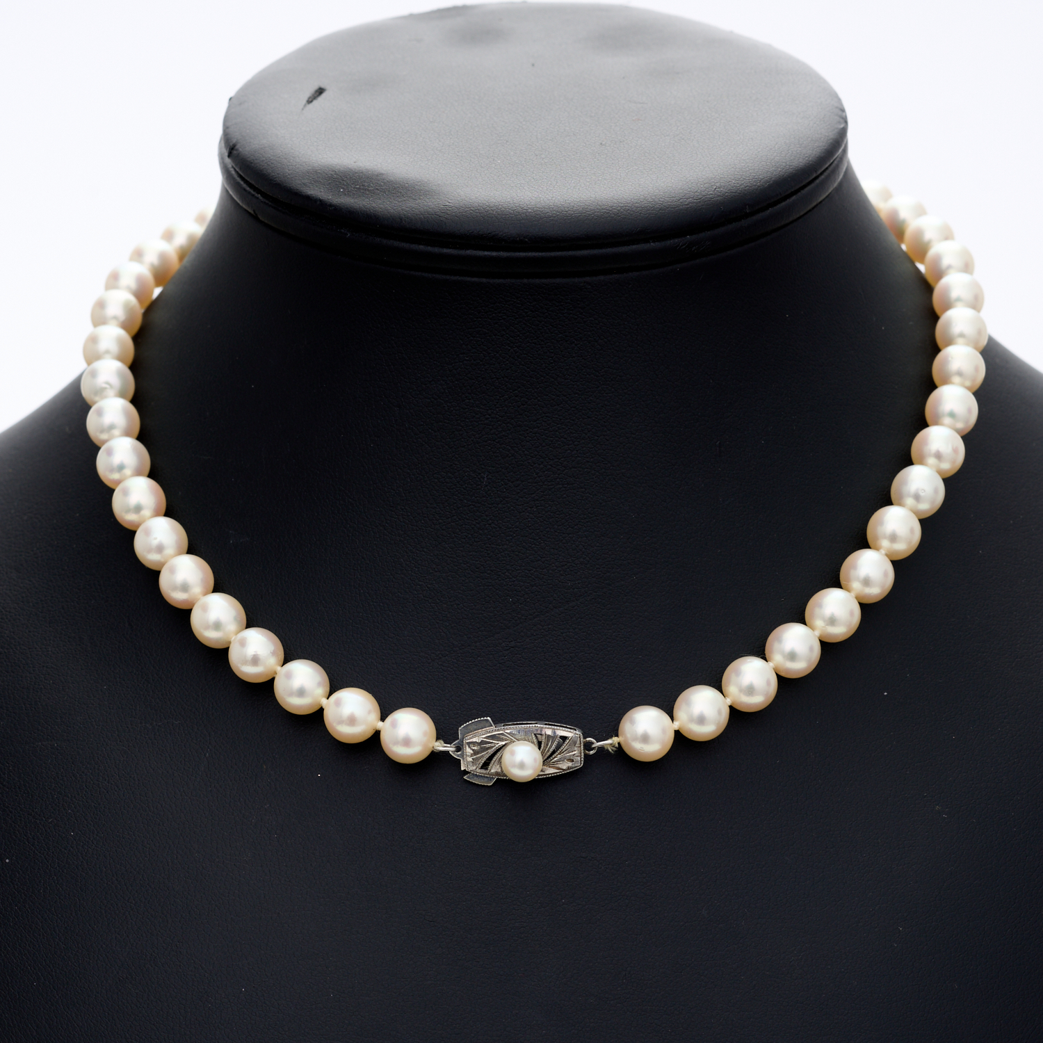 A CULTURED PEARL NECKLACE IN THE STYLE OF MIKIMOTO, TO SILVER PEARL SET-CLASP, APPROXIMATE DIAMETER OF PEARLS 7MM, LENGTH APPROXIMATELY 400MM