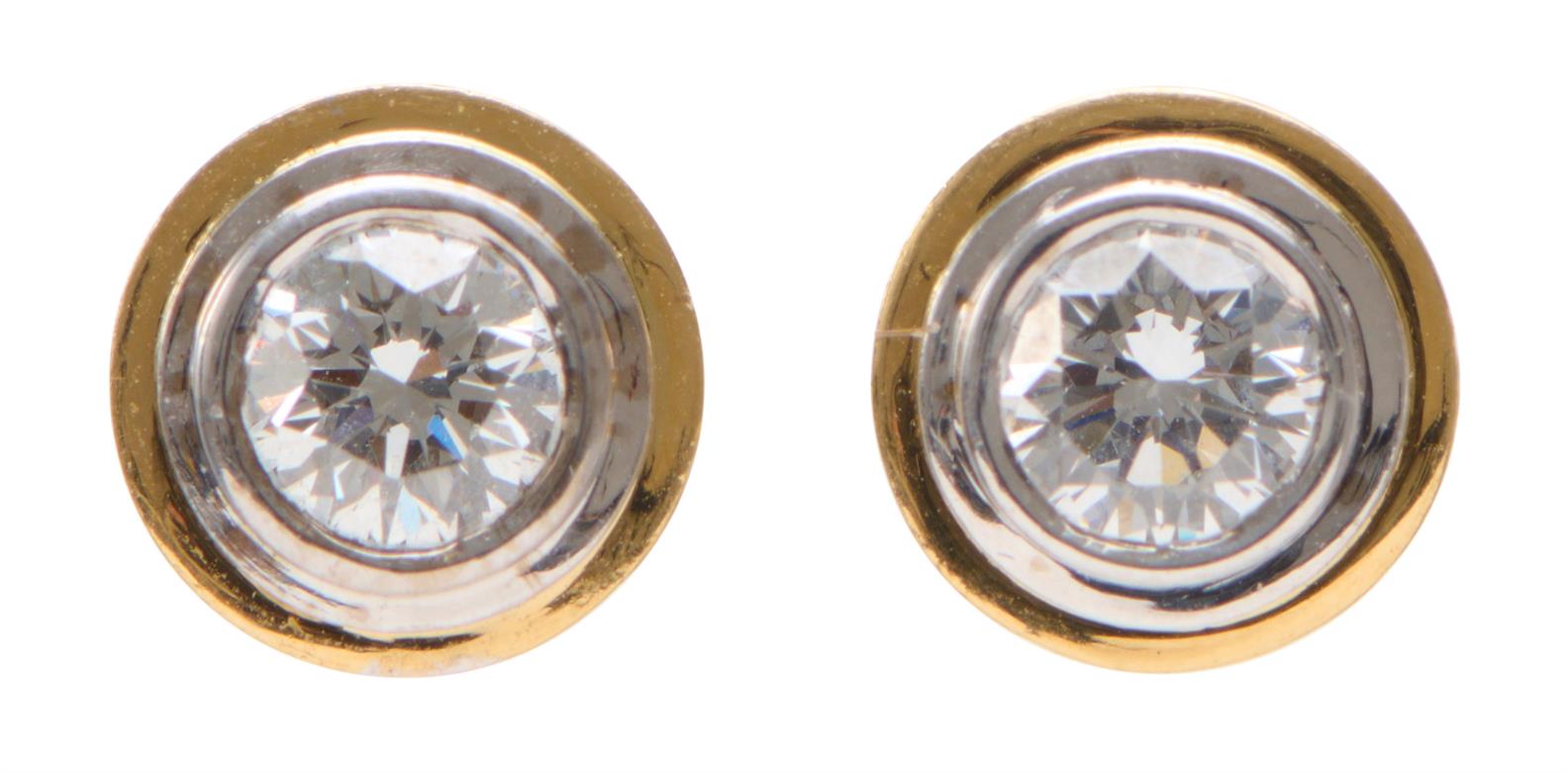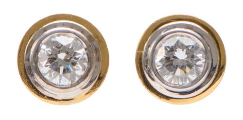Each earring centring a collet-set round-brilliant cut diamond weighing approximately 0.50 carats, in a circular two-tone gold setting, to post and butterfly fittings.