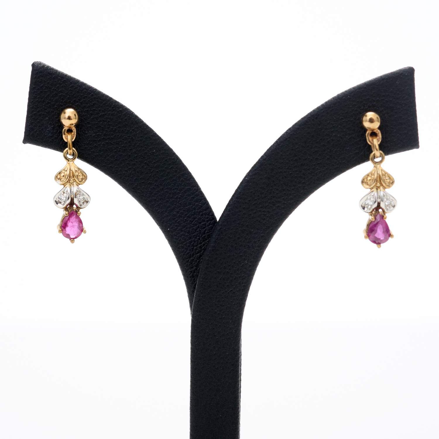 A PAIR OF TWO TONE RUBY AND DIAMOND STUD EARRINGS , TO POST AND BUTTERFLY FITTINGS