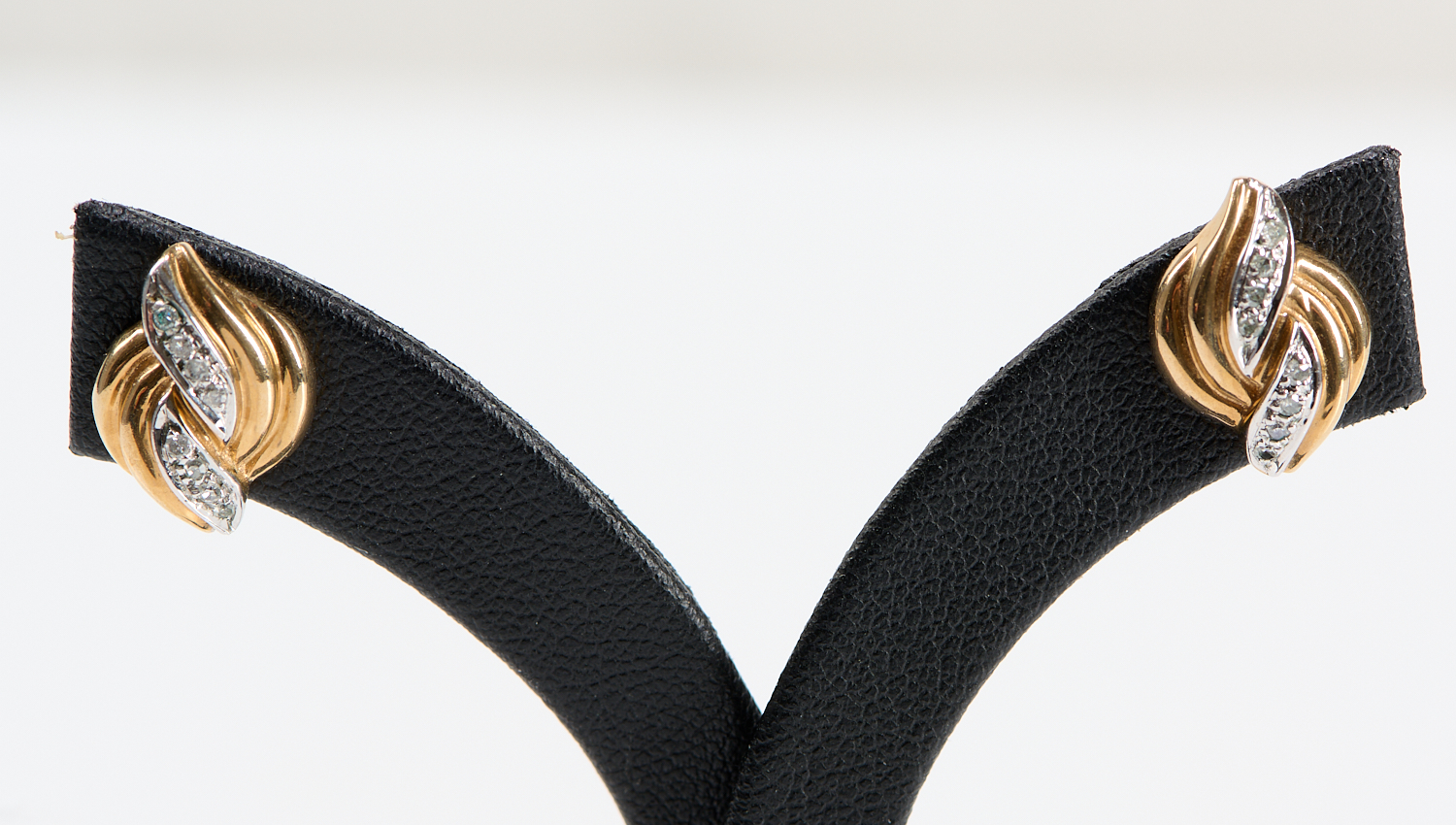 A PAIR OF DIAMOND SET STUD EARRINGS IN TWO TONE 9CT GOLD, TO POST AND BUTTERFLY FITTINGS