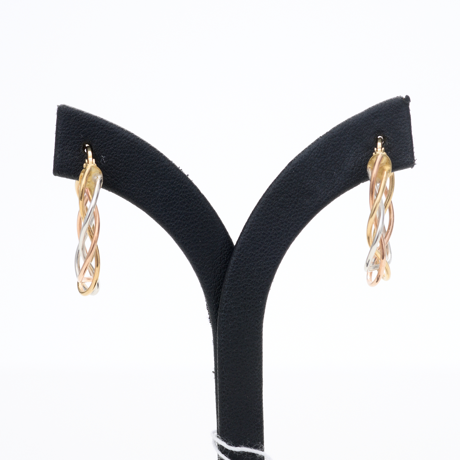 A PAIR OF TRI COLOUR HOOP EARRINGS IN 9CT GOLD, TO LEVER BACK FITTINGS