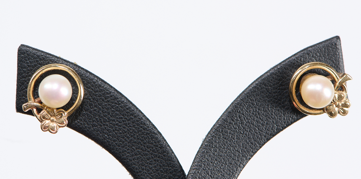 A PAIR OF PEARL SET STUD EARRINGS IN 9CT GOLD, TO POST AND BUTTERLFY FITTINGS
