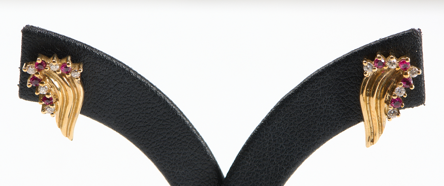 A PAIR OF RUBY AND DIAMOND SET EARRINGS IN 9CT GOLD, TO POST AND BUTTERFLY FITTINGS, 2.3GMS