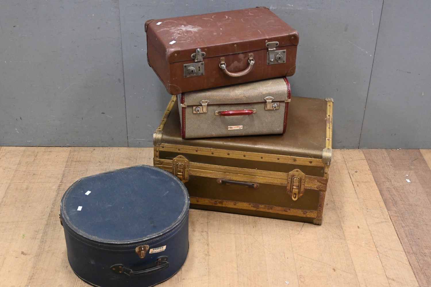 A COLLECTION OF FOUR VINTAGE TRAVELLING CASES - INCLUDING 1 BLUE HAT BOX (35H x 69W x 46D CM) (LEONARD JOEL DELIVERY SIZE: LARGE)