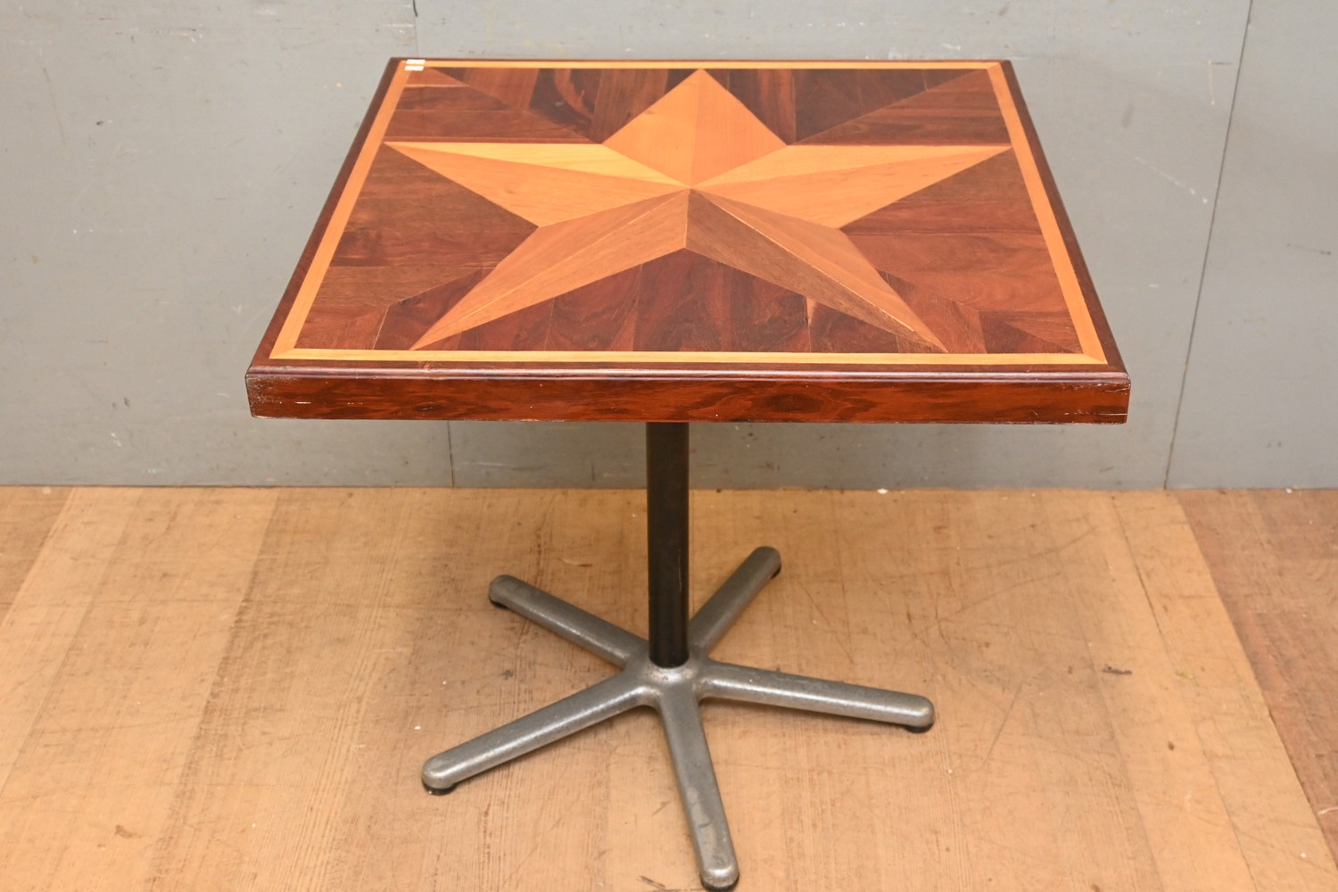AN AUSTRALIAN WOODEN TOPPED INLAID STAR PATTERN TABLE WITH METAL BASE (A/F) ( 73H X 78W X 78D CM) (LEONARD JOEL DELIVERY SIZE: LARGE)