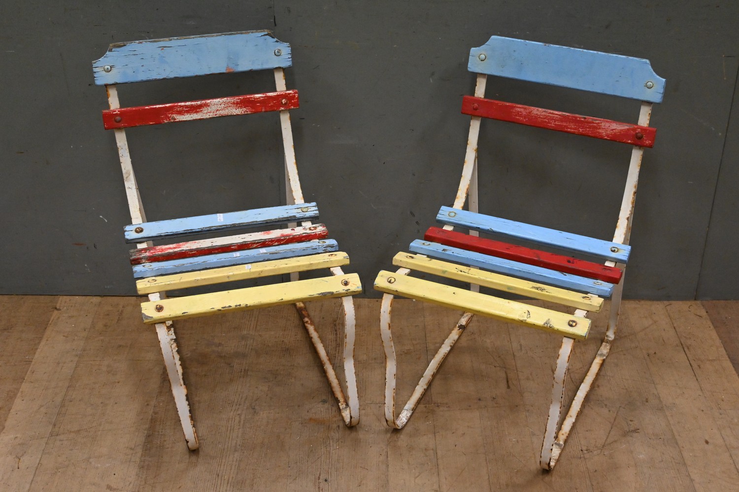 A PAIR OF AUSTRALIAN STEEL FRAMED ORIGINAL PAINTED OUTDOOR PATIO CHAIRS (A/F) (76H x 45W x 62D CM) (LEONARD JOEL DELIVERY SIZE: LARGE)