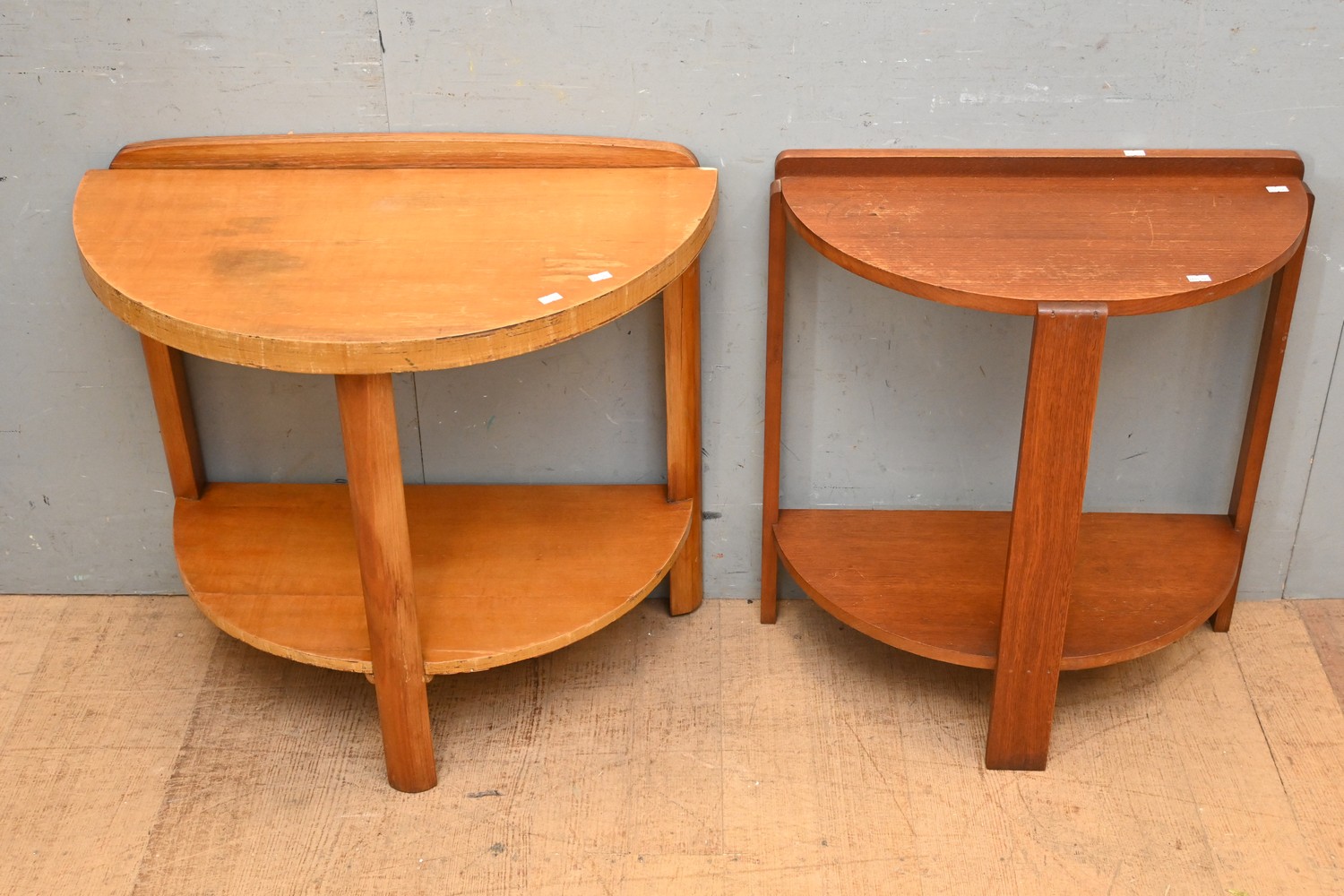 TWO ART DECO SEMI CIRCULAR SIDE TABLES INCLUDING BLONDWOOD AND HARDWOOD (A/F) (65H X 71W X 40DCM) (LEONARD JOEL DELIVERY SIZE: LARGE)