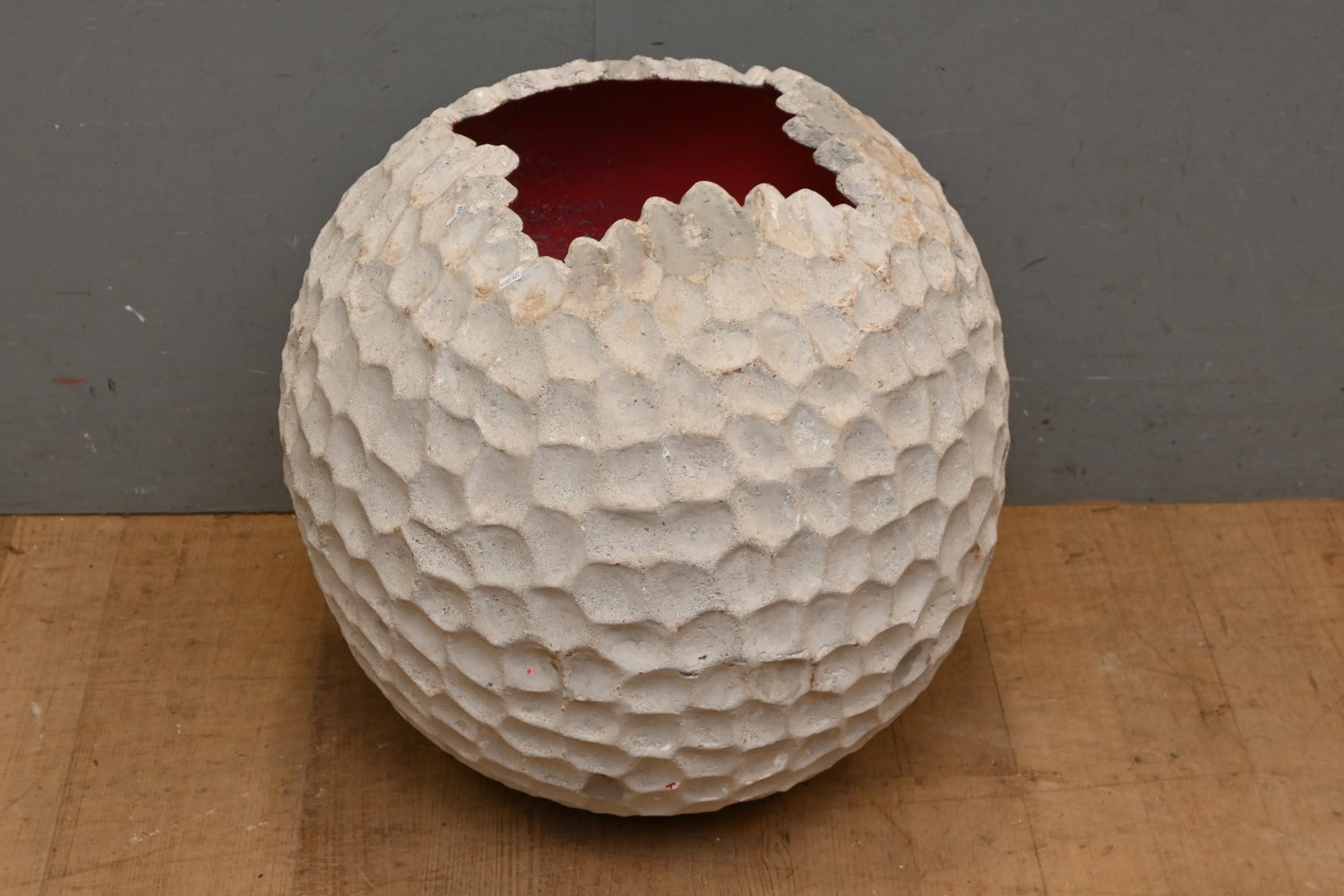 A LARGE AUSTRALIAN CONCRETE GOLF BALL / METEORITE FORM PLANTER (A/F) (62H CM) (PLEASE NOTE THIS HEAVY ITEM MUST BE REMOVED BY CARRIERS AT THE CUSTOMER'S EXPENSE. LEONARD JOEL STAFF CANNOT ASSIST CARRYING THIS ITEM) (X-LARGE ITEM)