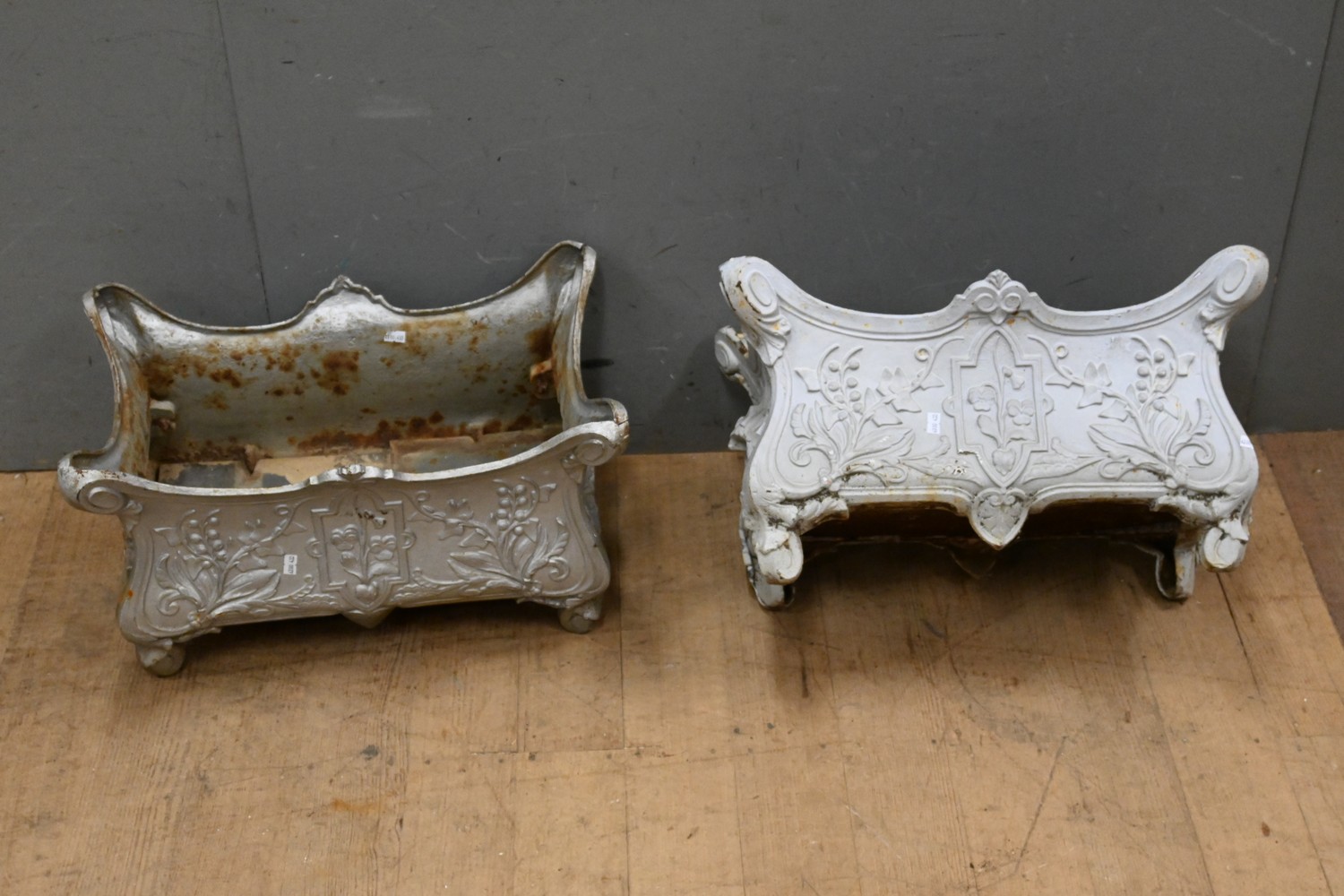 A PAIR OF LARGE FRENCH PAINTED CAST IRON FLORAL DECORATED RECTANGULAR PLANTER POTS (32H x 53W x 33D CM) (LEONARD JOEL DELIVERY SIZE: LARGE)