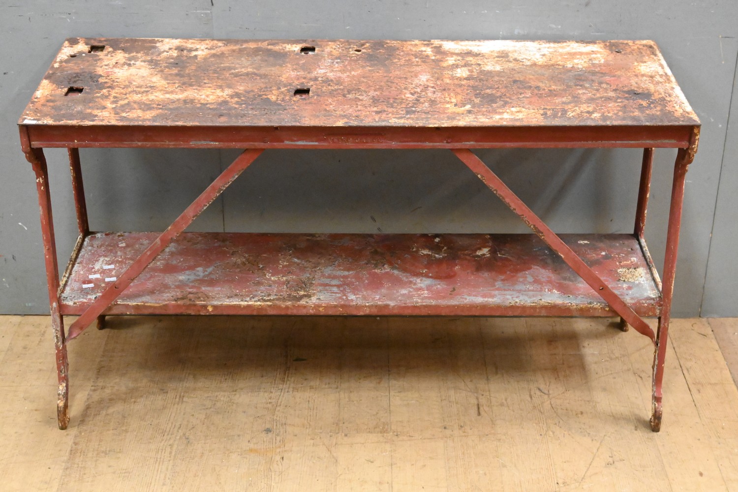 AN INDUSTRIAL METAL TWO TIER RECTANGULAR FORM METRO GAS COMPANY CAST IRON AND STEEL TWO TIER TABLE (A/F) (69H x 123W x 47D CM) (PLEASE NOTE THIS HEAVY ITEM MUST BE REMOVED BY CARRIERS AT THE CUSTOMER'S EXPENSE. LEONARD JOEL STAFF CANNOT ASSIST CARRYING THIS ITEM) (X-LARGE ITEM)