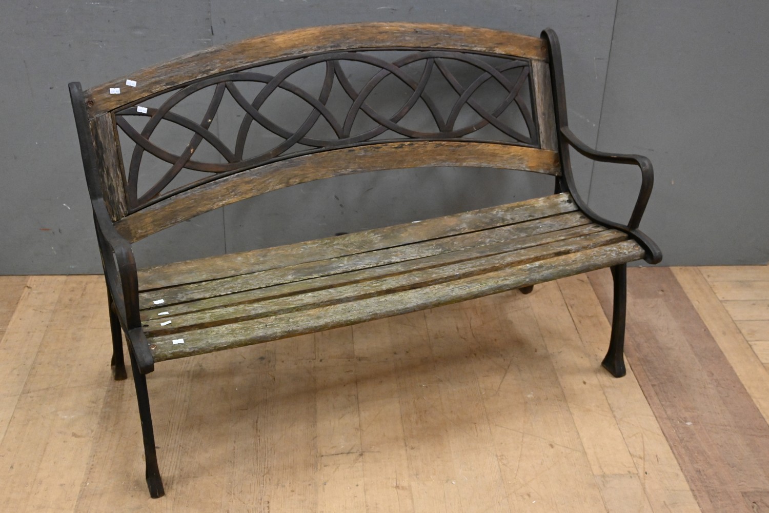 A CAST IRON SIDE AND BACK WOODEN SLATTED GARDEN BENCH (80H x 127W x 60D CM) (PLEASE NOTE THIS HEAVY ITEM MUST BE REMOVED BY CARRIERS AT THE CUSTOMER'S EXPENSE. LEONARD JOEL STAFF CANNOT ASSIST CARRYING THIS ITEM) (X-LARGE ITEM)
