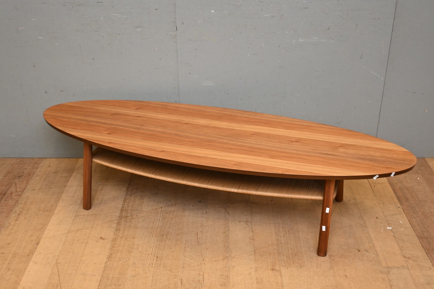 LARGE CONTEMPORARY OVAL FORM WOODEN COFFEE TABLE WITH LOWER RATAN SHELF ( 40H X 180W X 60D CM) (LEONARD JOEL DELIVERY SIZE: LARGE)