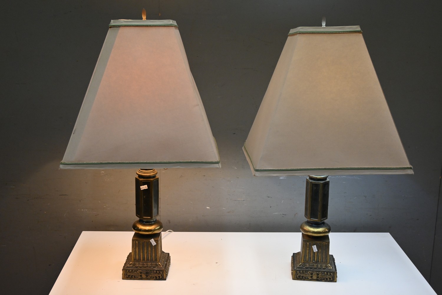 A PAIR OF BRASS EFFECT LAMPS WITH ORIGINAL SHADES (A/F) (87H CM) (LEONARD JOEL DELIVERY SIZE: LARGE)