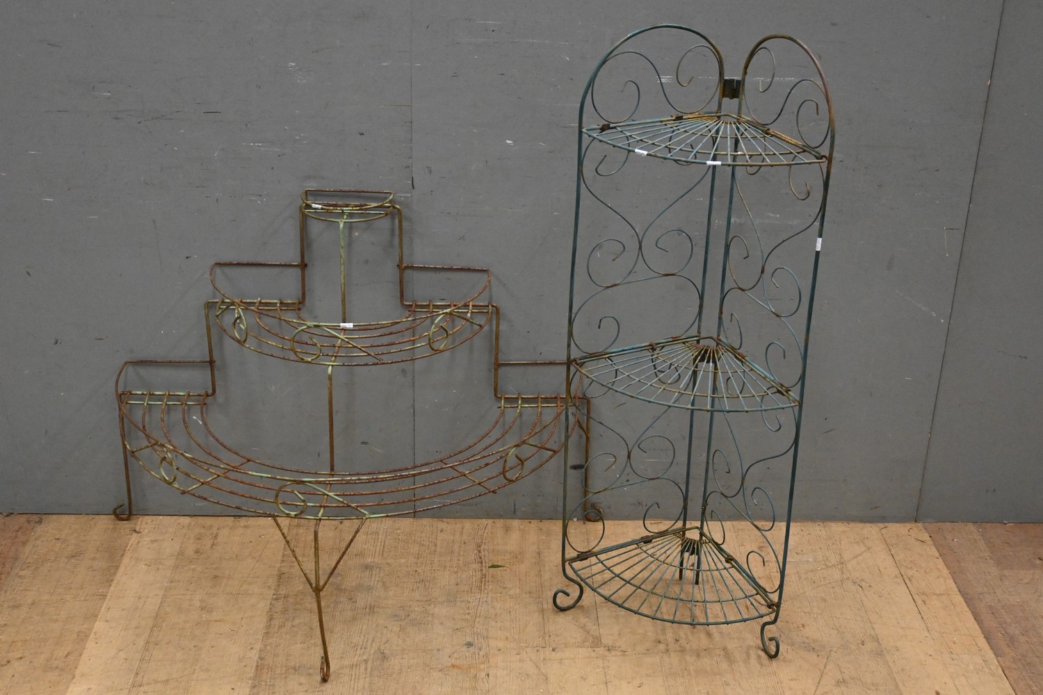 TWO AUSTRALIAN METAL PLANT STANDS - 1 SEMI CIRCULAR AND THE OTHER A FOLDING CORNER 3 TIER RACK (114H x 95W CM) (LEONARD JOEL DELIVERY SIZE: LARGE)