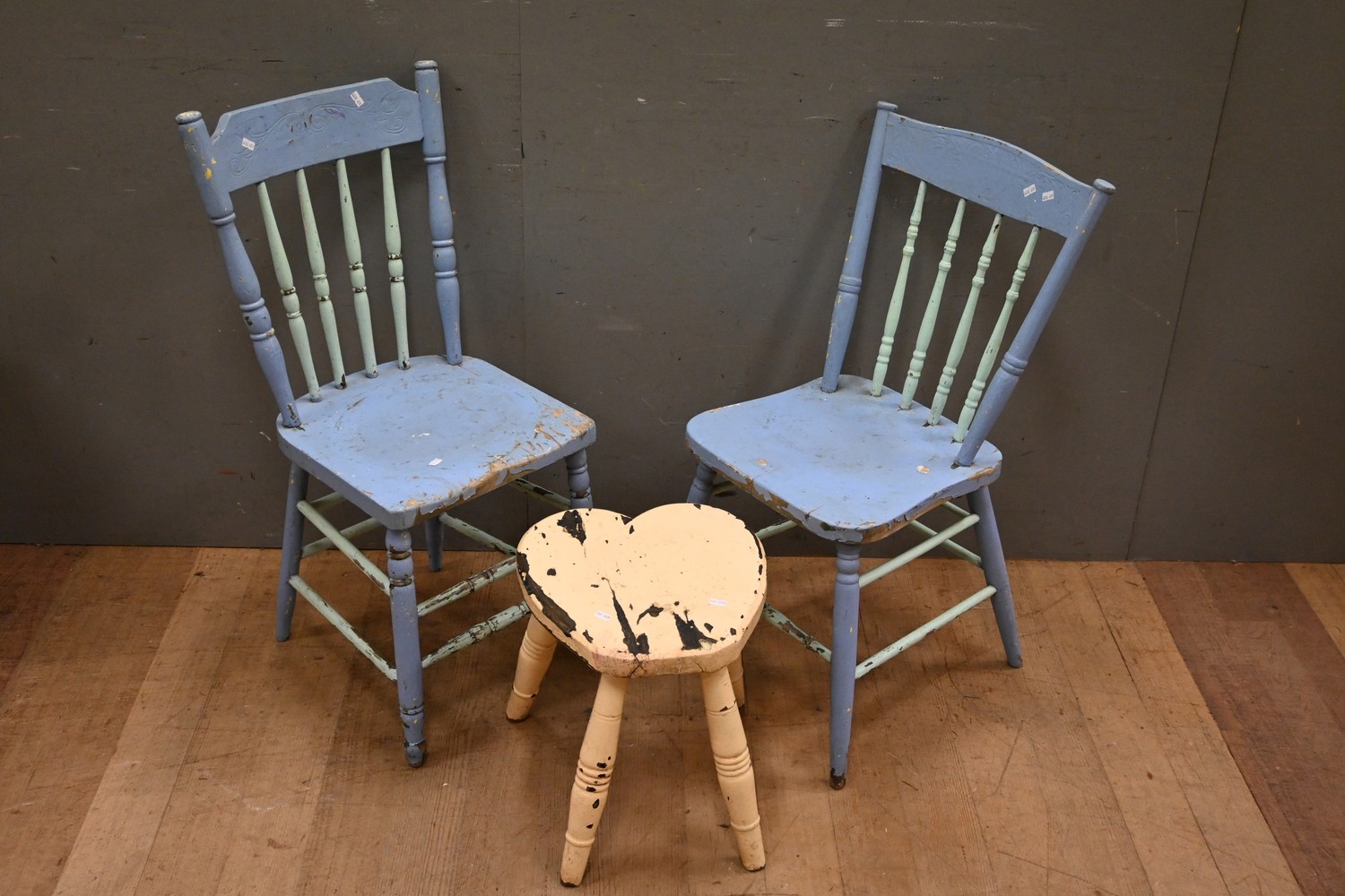 A GROUP OF THREE ANTIQUE AUSTRALIAN PAINTED CHAIRS WITH PRESSED BACKS AND A YELLOW HEART SHAPED TABLE (A/F) (87H x 43W x 46D CM) (LEONARD JOEL DELIVERY SIZE: LARGE)