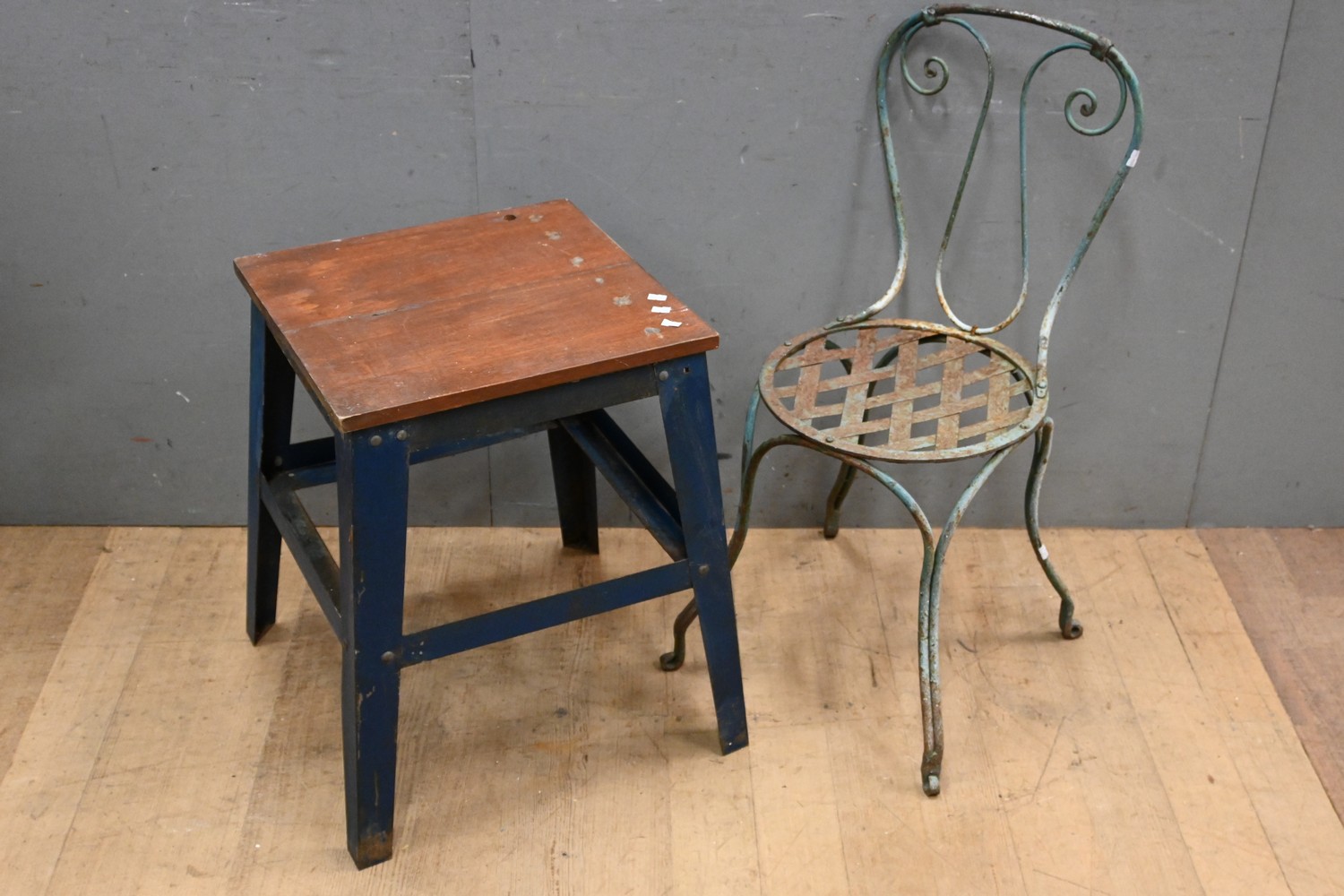 A FRENCH CAST IRON PATIO CHAIR IN ORIGIONAL BLUE TONES AND A PAINTED BLUE STEEL FRAMED WOODEN TOPPED TABLE (A/F) (61H x 49W x 49D CM) (LEONARD JOEL DELIVERY SIZE: LARGE)