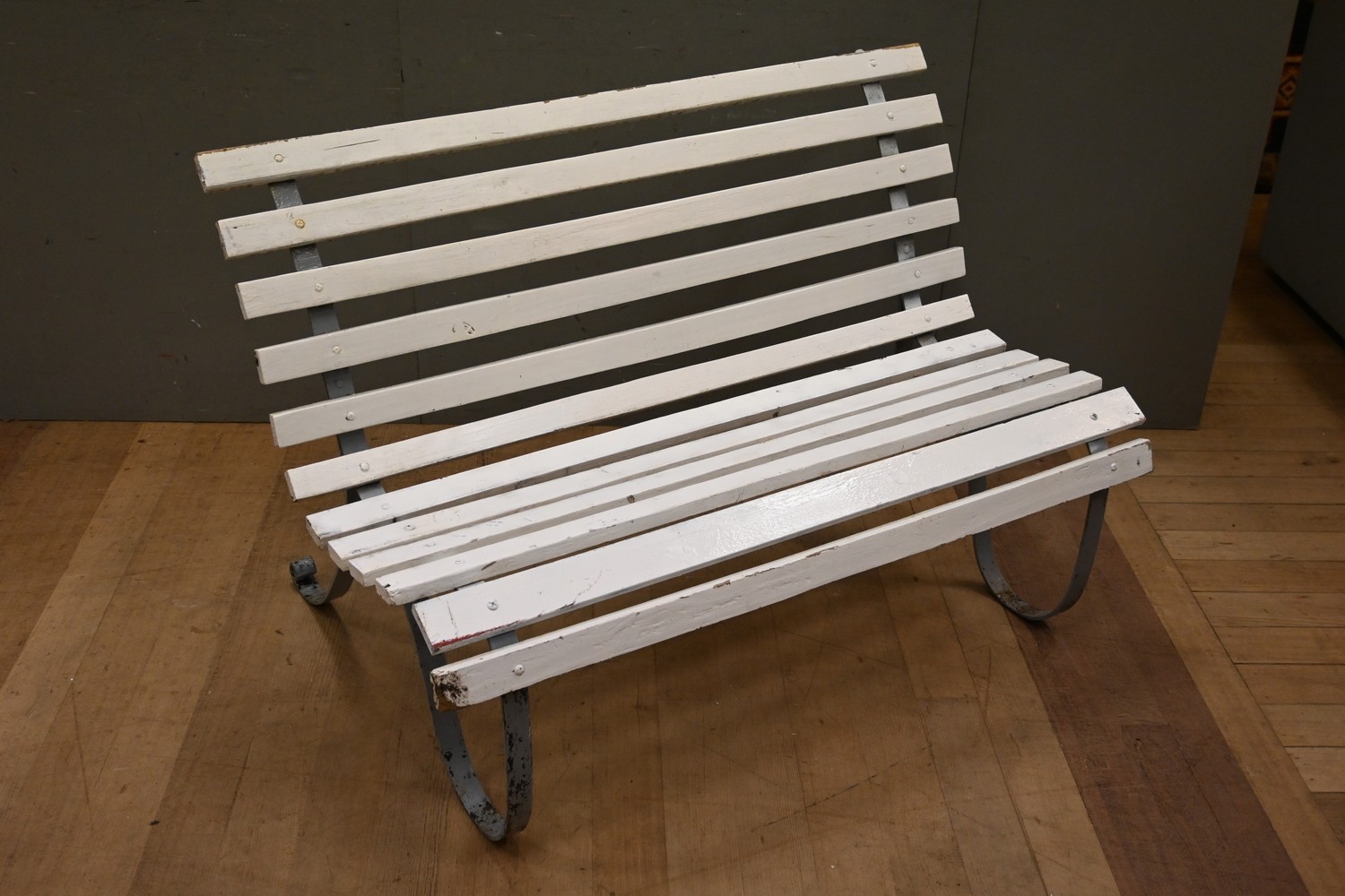 A STEEL FRAMED WHITE SLATTED GARDEN BENCH (A/F) (91H x 130W x 88D CM) (PLEASE NOTE THIS HEAVY ITEM MUST BE REMOVED BY CARRIERS AT THE CUSTOMER'S EXPENSE. LEONARD JOEL STAFF CANNOT ASSIST CARRYING THIS ITEM) (X-LARGE ITEM)