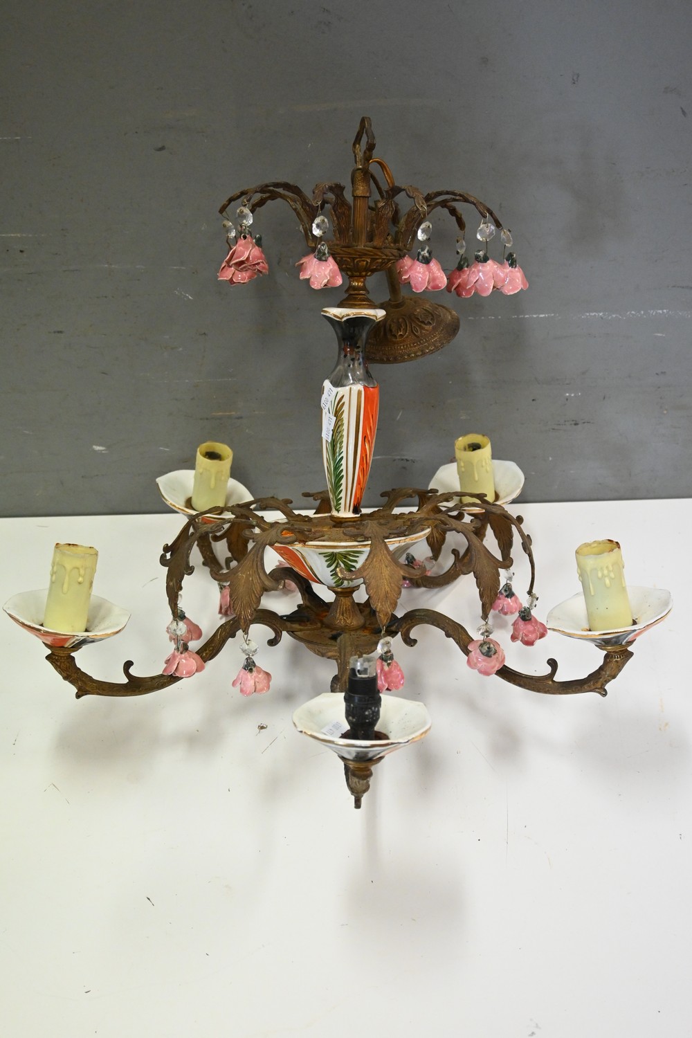 A RETRO BRASS AND CERAMIC FLORAL LIGHT FITTING ( 56H X 50 DIAMETER CM) (LEONARD JOEL DELIVERY SIZE: LARGE)