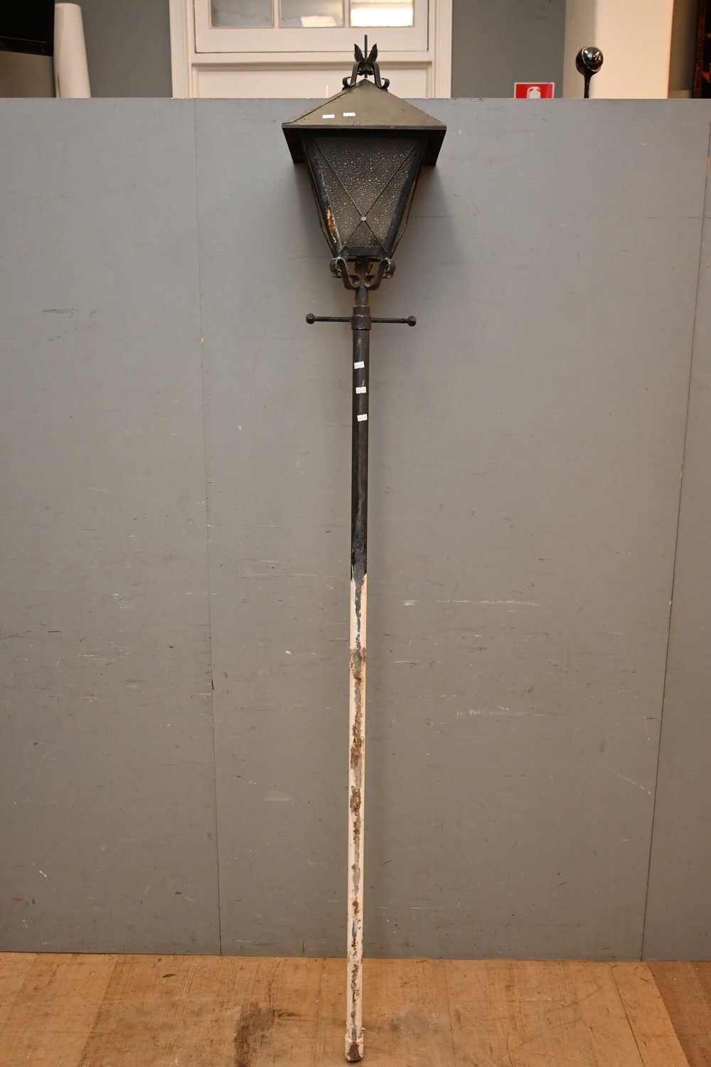 AN IRON AND ORIGIONAL GLASS OUTDOOR LAMP ON ORIGINAL STEEL POLE - FROM HAWTHORN HILL HOUSE (A/F) (220H CM) (LEONARD JOEL DELIVERY SIZE: LARGE)