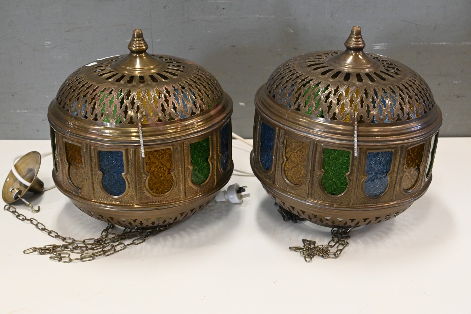 A PAIR OF BRASS AND STAINED GLASS HANGING PERSIAN CEILING LIGHT SHADES ( 37H X 34 DIAMETER CM) (LEONARD JOEL DELIVERY SIZE: MDEIUM)