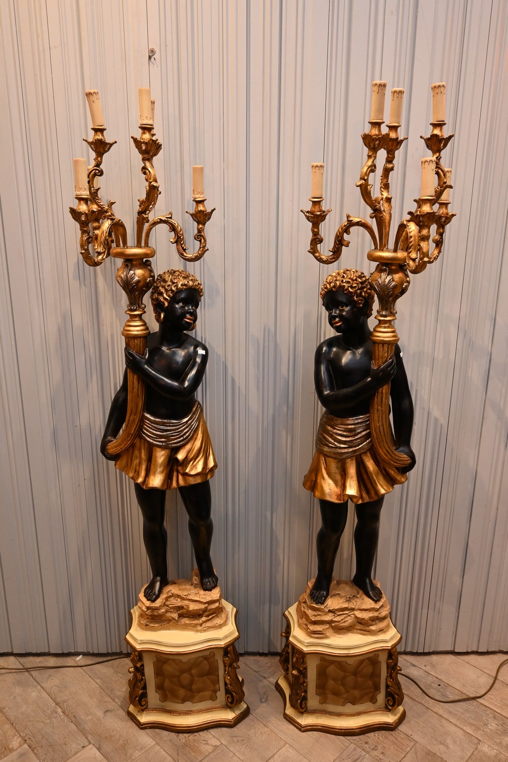 AN IMPRESSIVE PAIR OF ITALIAN PAINTED BLACKAMOOR FIGURAL STANDARD LAMPS WITH FIVE LAMP METAL CANOPYS (A/F) (FOREIGN PLUG) (200H x 43W x 34D CM) (PLEASE NOTE THIS HEAVY ITEM MUST BE REMOVED BY CARRIERS AT THE CUSTOMER'S EXPENSE. LEONARD JOEL STAFF CANNOT ASSIST CARRYING THIS ITEM) (X-LARGE ITEM)