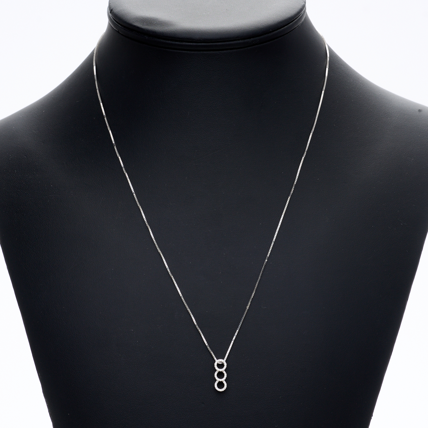 A DIAMOND PENDANT IN 18CT WHITE GOLD, TO A FINE TRACE CHAIN IN 9CT WHITE GOLD