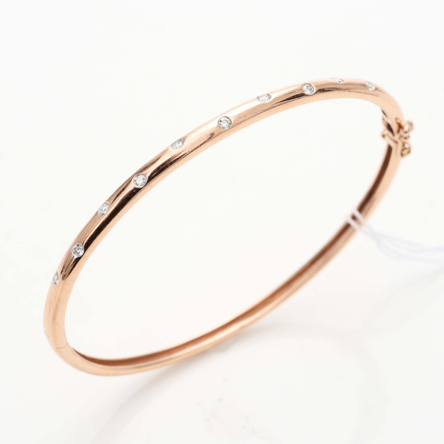 A HAMMER SET DIAMOND BANGLE IN 9CT ROSE GOLD, BY MAZZUCCHELLI'S, INNER DIAMETER 60MM, 9.01GMS, BOXED