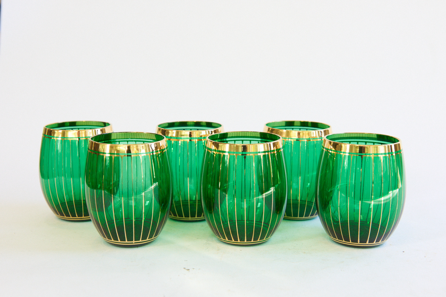 SET OF SIX 1950S ITALIAN GREEN GLASS AND GILDED TUMBLERS H.9.5CM, LEONARD JOEL LOCAL DELIVERY SIZE: MEDIUM