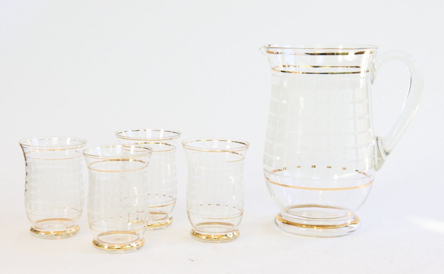 A RETRO DRINK SET COMPRISING JUG AND FOUR MATCHED TUMBLERS WITH CROSS HATCHED DESIGN, LEONARD JOEL LOCAL DELIVERY SIZE: MEDIUM
