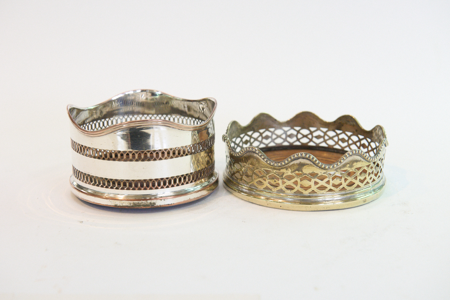 TWO 19TH CENTURY PIERCED SIDE SHEFFIELD PLATE WOODEN BASED WINE BOTTLE COASTERS DIA.14CM, LEONARD JOEL LOCAL DELIVERY SIZE: SMALL